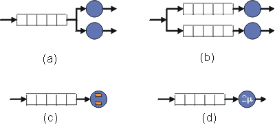b. Auch hier stehen zwei parallele Bediener zur Verfügung. Allerdings werden die Kunden bereits bei ihrer Ankunft gleichmäßig (d. h. zu je 50%) auf die beiden Warteschlangen verteilt.