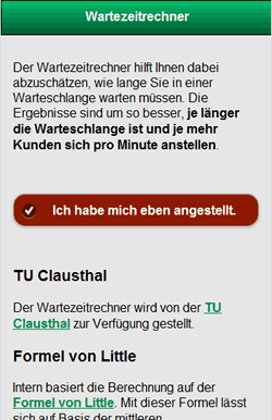 Diese Rechnung kann Ihnen der Wartezeitrechner für Smartphones abnehmen und Ihnen basierend auf diesen einfachen Eingabegrößen eine Abschätzung der eigenen Wartezeit berechnen. Zur Nutzung des Wartezeitrechners wird lediglich ein Javascript-fähiger Browser benötigt.