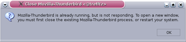 Das E-Mail-Programm "Thunderbird" wurde unerwartet beendet. Ein Neustart des Programms ist nicht möglich bzw. verläuft nicht erfolgreich, d.h. das Programm beendet sich, ohne vollständig gestartet zu sein. Eine Fehlermeldung der folgenden Art wird angezeigt: