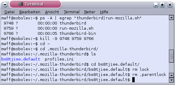 Prüfen Sie durch Eingabe der folgenden Befehle, ob auf Ihrem Rechner noch Prozesse von "Thunderbird" laufen, und töten Sie diese: